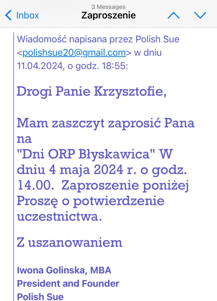 For the record, K. Magier was invited by Polish Sue to our “ORP BŁYSKAWICA DAYS” in Portsmouth in May 2024, which took place under the honorary patronage of the President of the IPN. After this event, Polish Sue, together with the IPN, arrived in Cowes the next day.