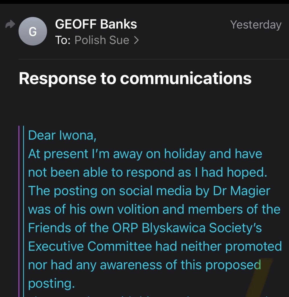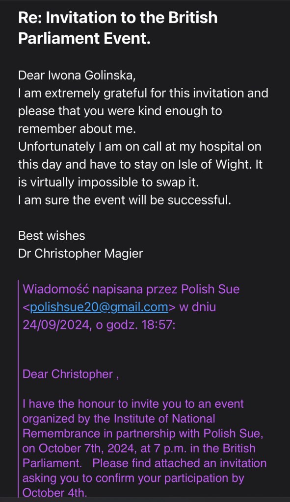 Ponadto, K. Magier twierdził w rozmowach z Instytutem Pamięci Narodowej w Warszawie – gdzie dzwonił twierdząc, że nie otrzymał zaproszenia na wydarzenie IPN w Parlamencie Brytyjskim w dn. 7/10/24, ( spotkanie które było organizowane przez IPN w partnerstwie z Polish Sue i innymi organizacjami). K. Magier po raz kolejny minął się tu z prawdą – wysłaliśmy mu zaproszenie na to spotkanie i posiadamy jego korespondencje, na którą odpowiedział w tym temacie.