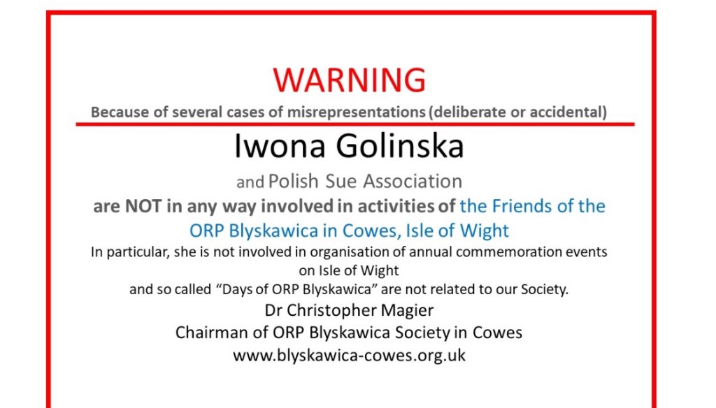 Polish Sue is the organizer of the ORP BŁYSKAWICA DAYS and we have never claimed responsibility for organizing the celebrations in Cowes. However, we have always supported the celebrations in Cowes – which are an event open to the general public, and participation in them does not require any registration.