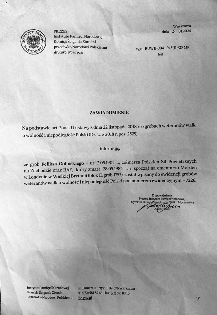 Following the decision of the President of the Institute of National Remembrance, Dr. Karol Nawrocki, we received the official entry of the grave of Engineer Feliks Golinski, a soldier of the PAF (Polish Air Force in the West) and RAF, who died on May 28, 1983 and was buried at the Morden Cemetery in London, in the register of graves of veterans of the fight for Poland’s freedom and independence under the registration number – 7226.