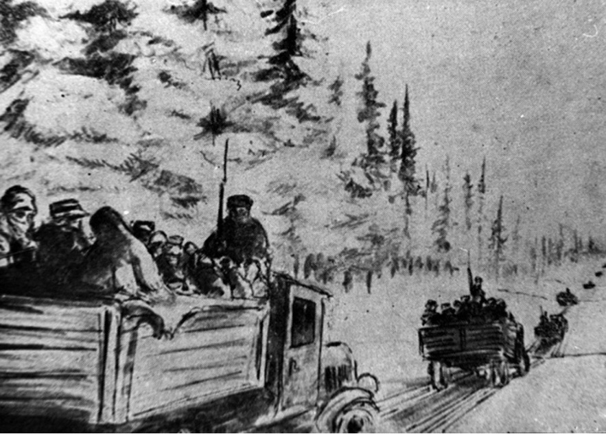 Transport więźniów odkrytymi ciężarówkami po drodze z drewnianych okrąglaków w okolicy Kotłasu w lutym 1940 r. Rys. nieznanego łagiernika. Źródło: IPN