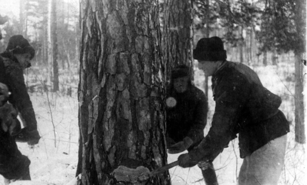 Deportowani 10 lutego 1940 r. z Kolonii Sobótka w pow. podhajeckim woj. Tarnopolskie przy pracy w tajdze. Dworyszcze, rejon kazaczyński, Krasnojarsk. Source: IPN