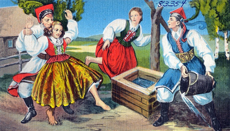 A postcard showing youth dousing each other with water on Śmigus-dyngus
