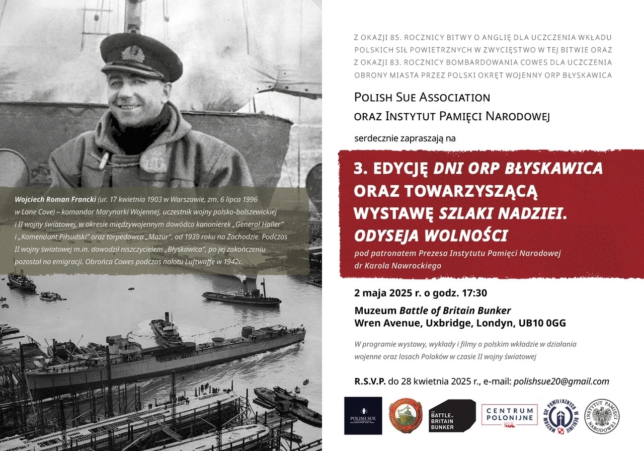 2 maja 2025 r. Polish Sue Association i Instytut Pamięci Narodowej (IPN) z dumą zorganizują trzecie doroczne „Dni ORP Błyskawica” w Bunkrze Bitwy o Anglię „ Battle of Britain Bunker” w Uxbridge w Londynie. To upamiętniające wydarzenie, odbywające się pod honorowym patronatem dr. Karola Nawrockiego, prezesa IPN, jest hołdem dla niezłomnego ducha Polskich Sił Zbrojnych … Continue reading Oddajemy cześć odwadze polskich bohaterów: 3. edycja „Dni ORP Błyskawica” – ożywia historię w Londynie.