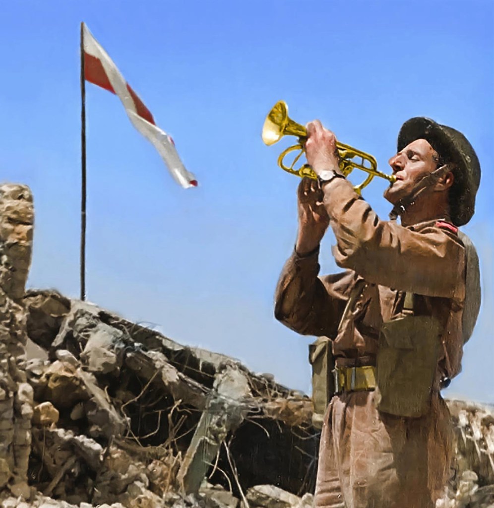 At noon, Master Corporal Emil Czech, a bugler from the Carpathian Rifles, climbed the rubble and played the haunting St. Mary’s bugle call — a tradition normally reserved for Kraków’s Wawel Cathedral. This time, it echoed through the ruins of war, symbolizing both mourning and triumph.