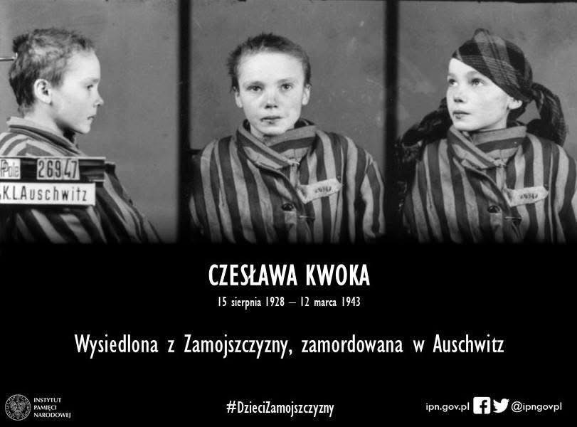 Jednym z symboli tragedii polskich dzieci jest Czesława Kwoka, czternastolatka wywieziona do Auschwitz pierwszym transportem z obozu przejściowego w Zamościu.