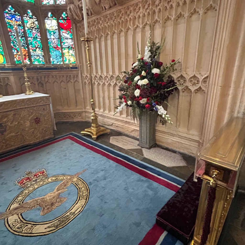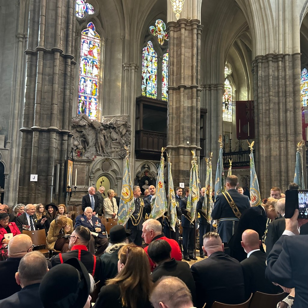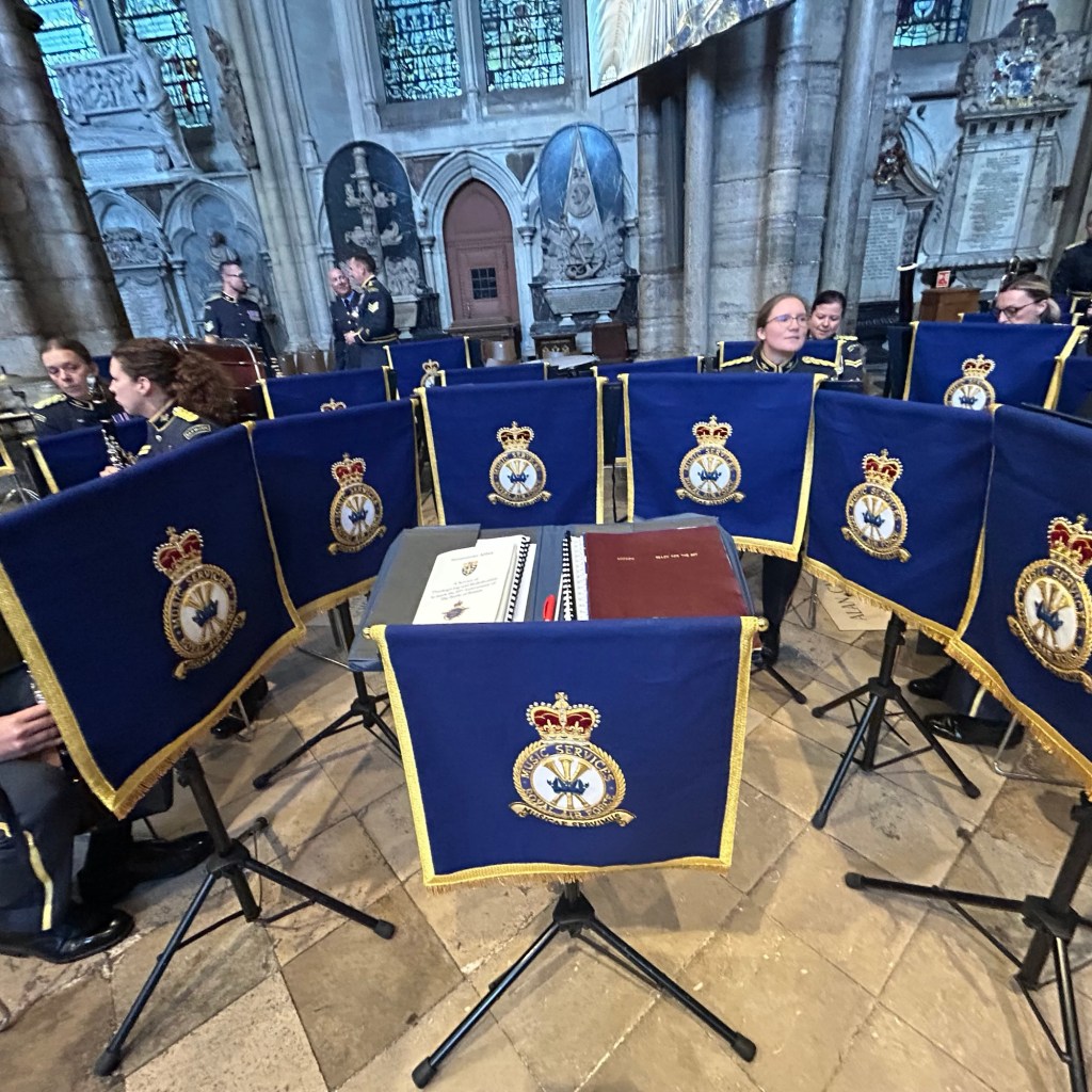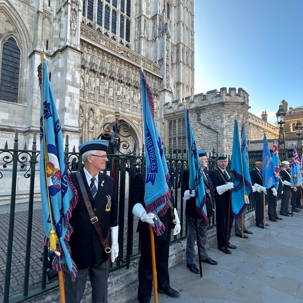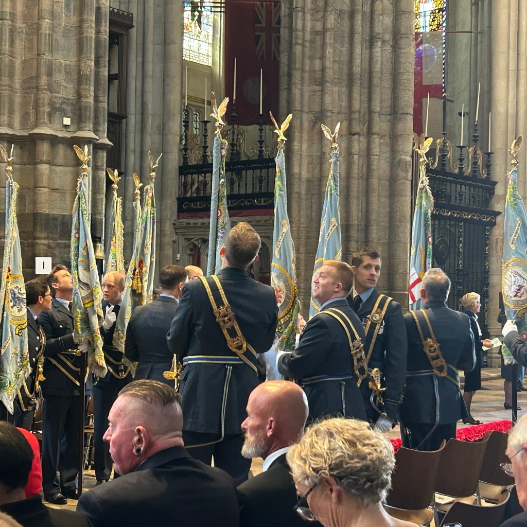 The 85th anniversary service at Westminster Abbey began with a ceremonial Lining Party at the Great West Door, formed by the King’s Colour Squadron, Royal Air Force, alongside national standards from the Royal Air Forces Association, Bomber Command Association, Air Transport Auxiliary Association, Royal Observer Corps Association, and others.