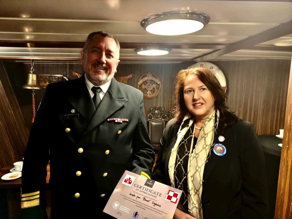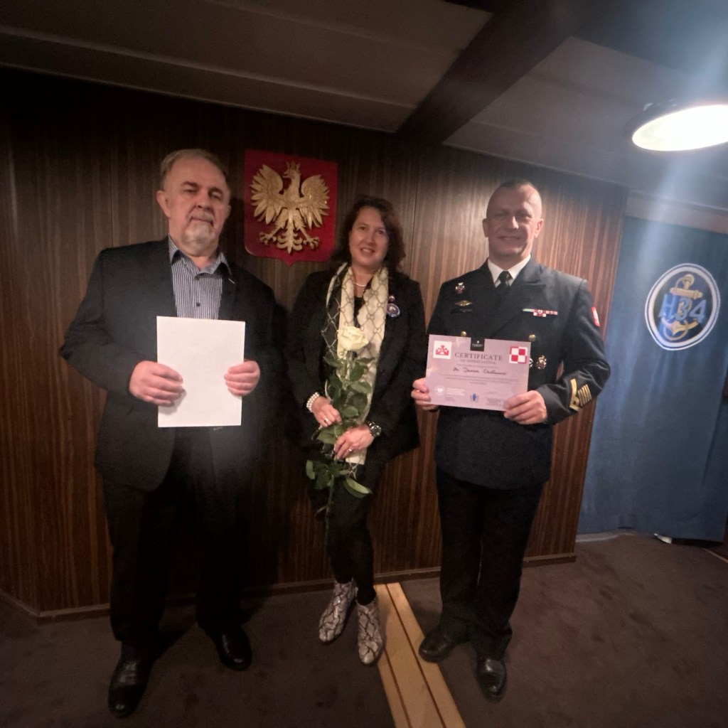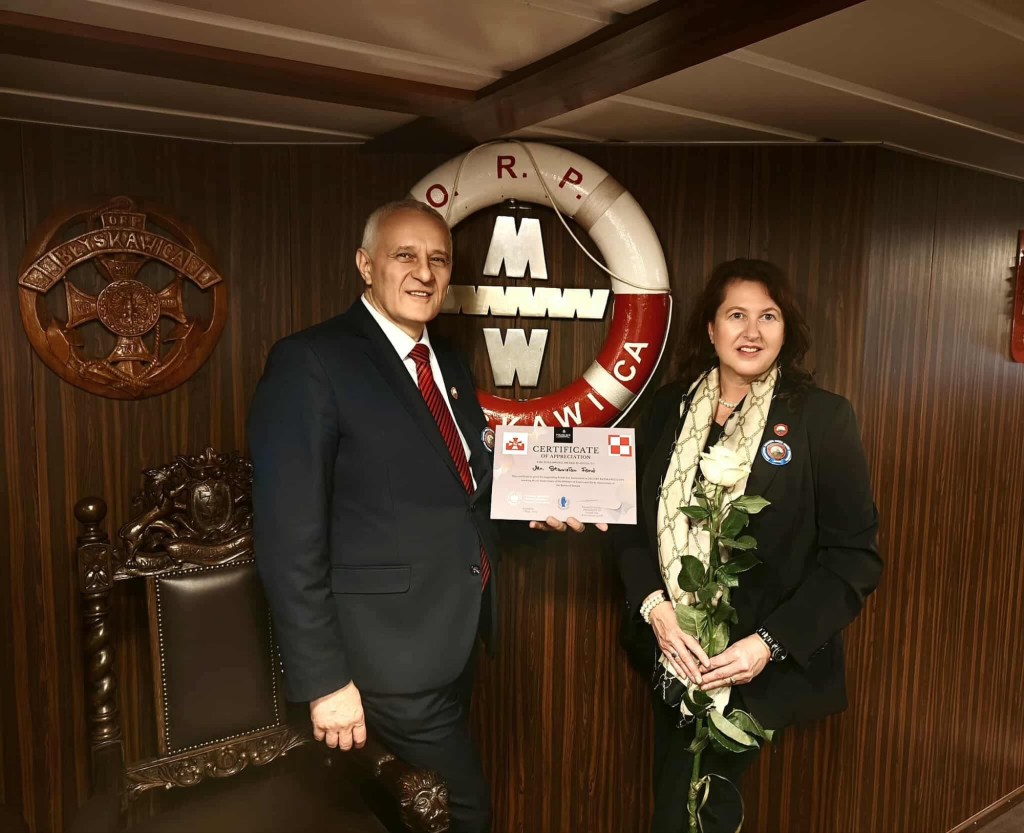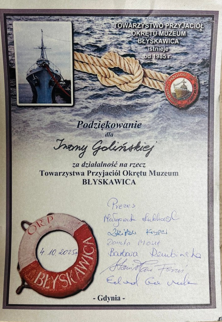 She is an activist promoting the history of the “Błyskawica” (Lightning), from Cowes on the Isle of Wight. Long-time members of the Polish Navy (TPOMB): Edward Gawenda, Edward Czyż, Kazimierz Żmuda, Robert Kędzia, Irena Matejczyk, Agnieszka Pioruńska, commanders: Rear Admiral Andrzej Ogrodnik, Rear Admiral Mirosław Jurkowlaniec, retired Vice Admiral Maciej Węglewski.