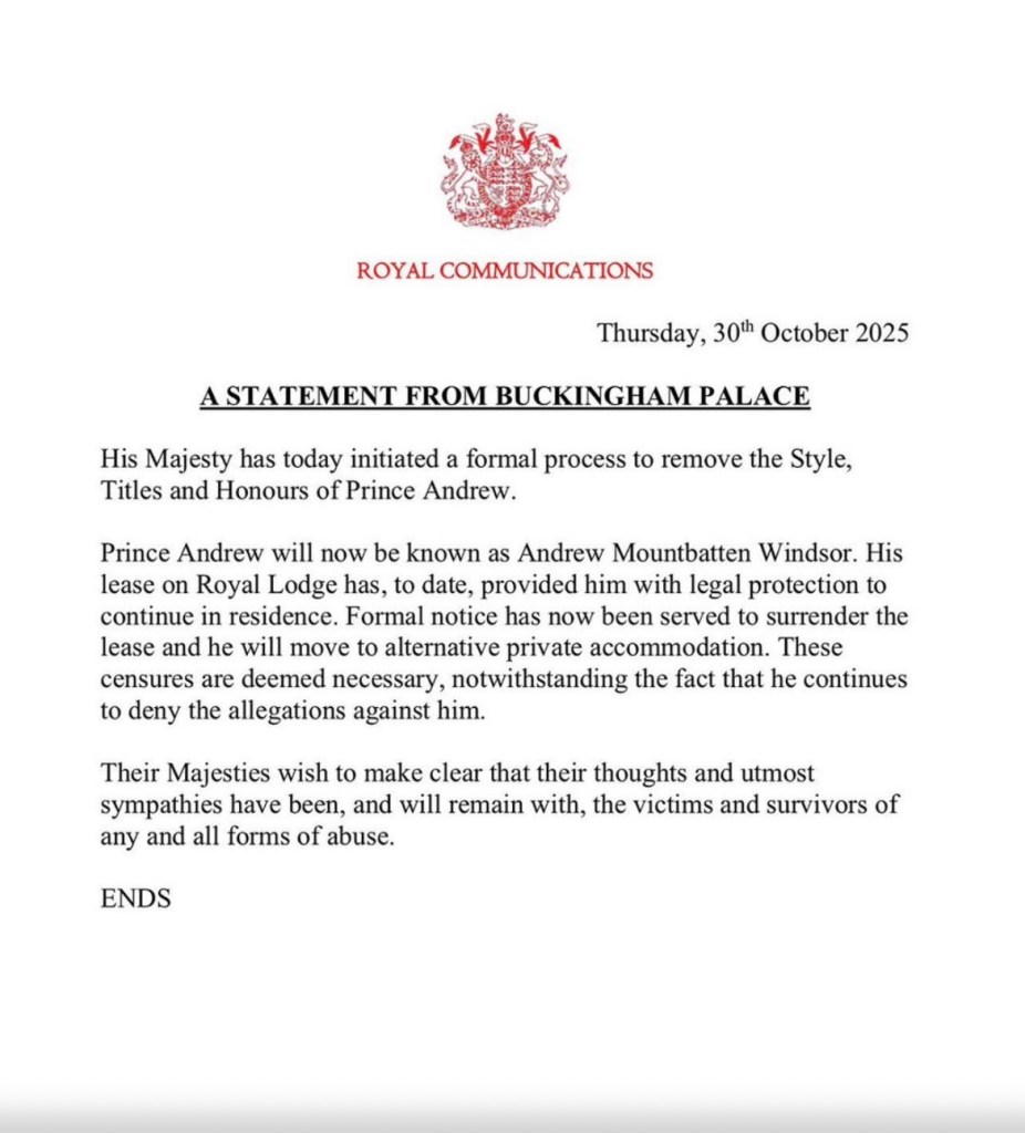 Londyn, 30 października 2025 r. – Pałac Buckingham wydał w czwartek oficjalne oświadczenie, w którym poinformowano, że Jego Królewska Mość Król Karol III rozpoczął formalny proces odebrania księciu Andrzejowi wszelkich stylów, tytułów oraz honorów królewskich.