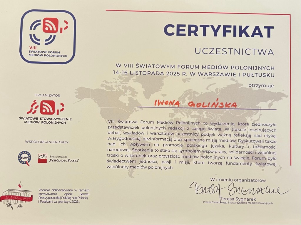 Polish Sue President – Iwona Golińska, received a certificate of particlpation from Teresa Sygnarek, President of the ŚSMP! It was worth visiting the Forum, as it provides a unique space for exchanging experiences, establishing international contacts, and discussing the role of Polish diaspora media in building unity and countering disinformation. The Forum provides inspiration, knowledge, and real support in our daily media work. Thank you ŚSMP!