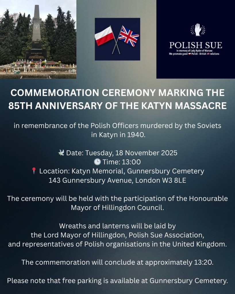 The Polish Sue Association in the UK cordially invites you to participate in a ceremony commemorating the 85th anniversary of the Katyn Massacre, dedicated to the memory of over 21,000 Polish officers, policemen, civil servants, and members of the intelligentsia murdered by the Soviet authorities in 1940.