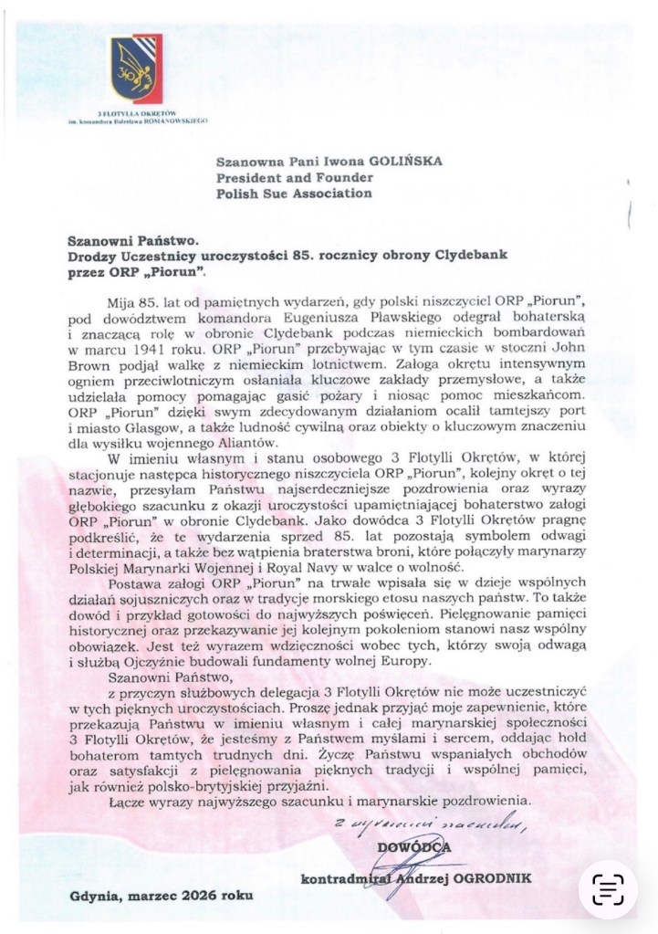 W swoim przesłaniu kontradmirał Ogrodnik przypomniał dramatyczne wydarzenia marca 1941 roku, kiedy to niszczyciel ORP „Piorun”, dowodzony przez Eugeniusza Pławskiego, stanął do walki w obronie Clydebank podczas niemieckich nalotów.